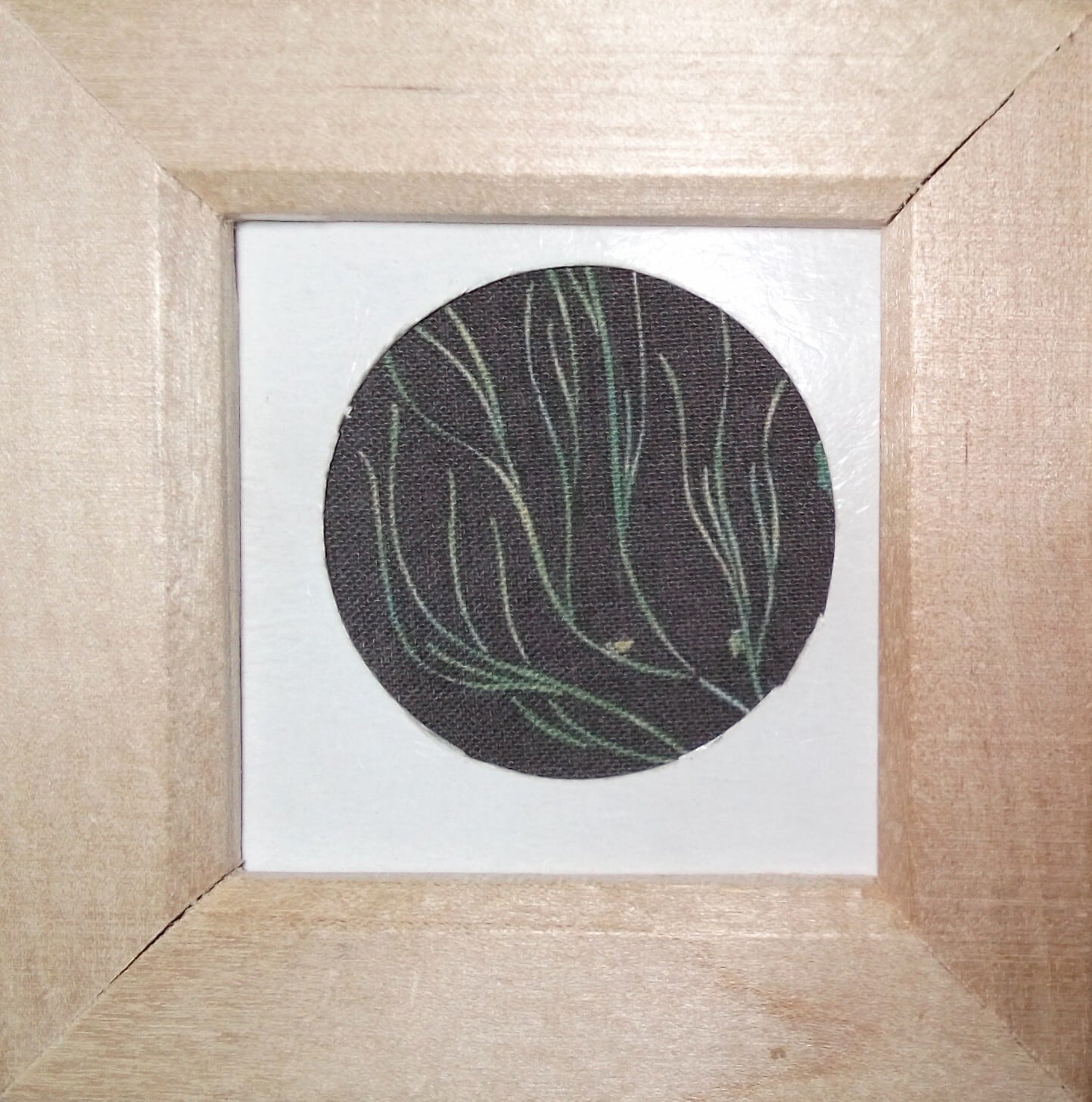 黒をバックとしたステンドグラス風な絵から、巻貝の仲間のカワグチツボ柄です。水生植物は葉の細~いリュウノヒゲモ。