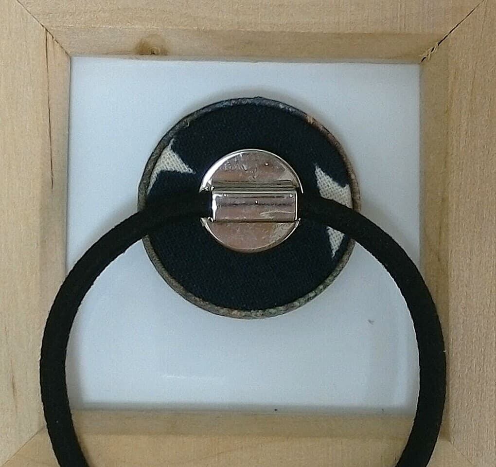 ◆サイズ:φ27㎜のくるみボタンを使用。ゴムは「黒色」で大きさ「約φ5㎝」、金属は「銀色」です。