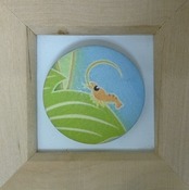 水色地にヌカエビ柄です。ヌカエビのオレンジ色はイメージの色で、実際は半透明の個体が多いとか。緑の葉はミズオオバコ。