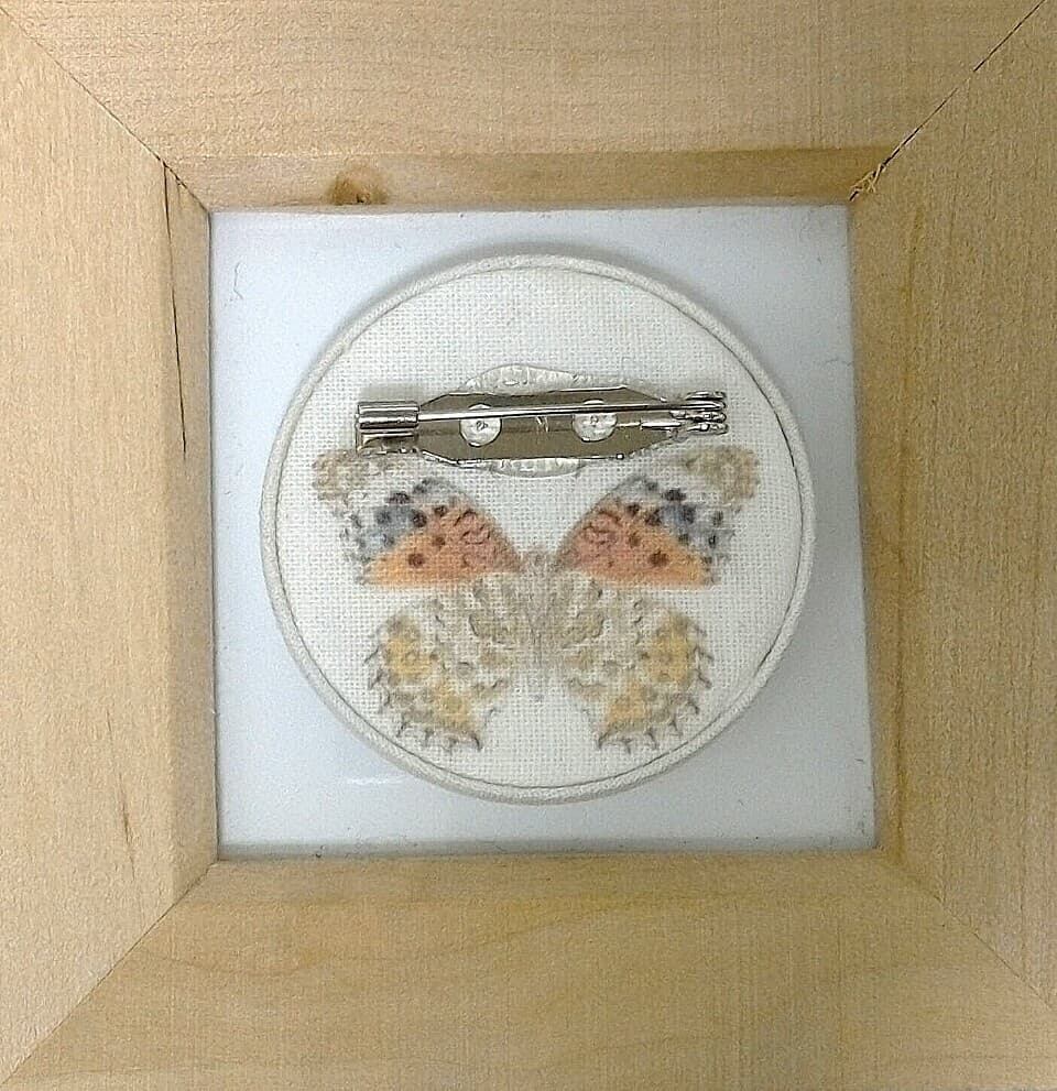 繊細で優しい画風です。表側にツマグロヒョウモン♀の背面、裏側に腹面を配置。つけると裏側はみえないんだけれども。
