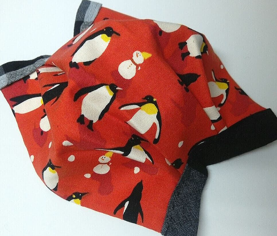 ペンギン柄の布地にはめずらしい赤地。雪だるまとともに。