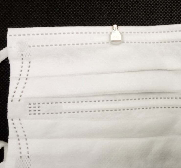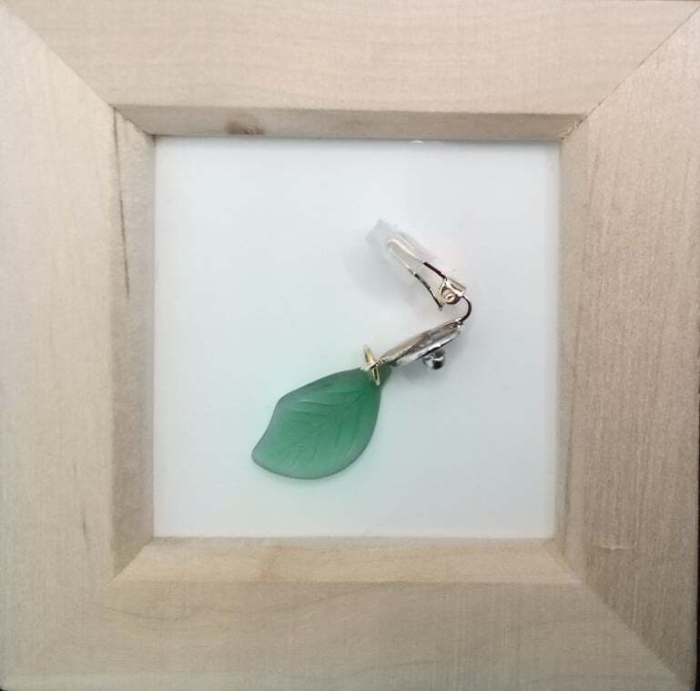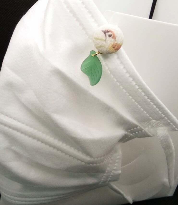 〇クリップ式のマスク飾り、揺れるチャーム(緑色の葉っぱ・擦りガラス風)付きです。