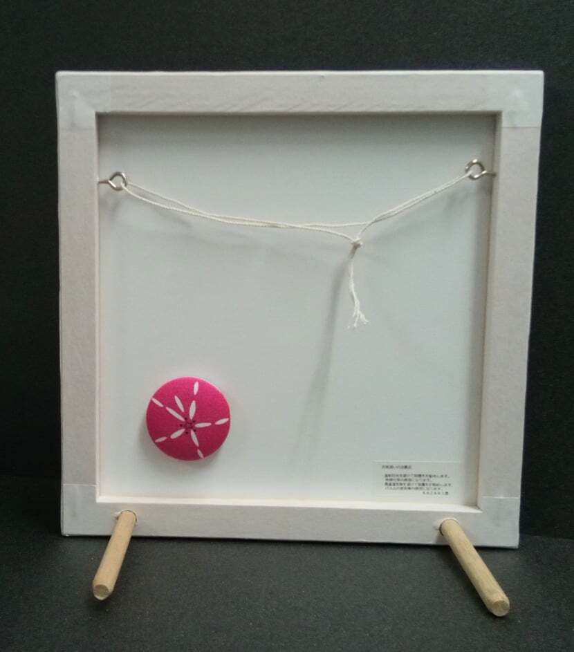 ▼壁掛け用のタコ糸とヒートン2個、立てかけ用の木ダボ(約8㎝)2個付です。