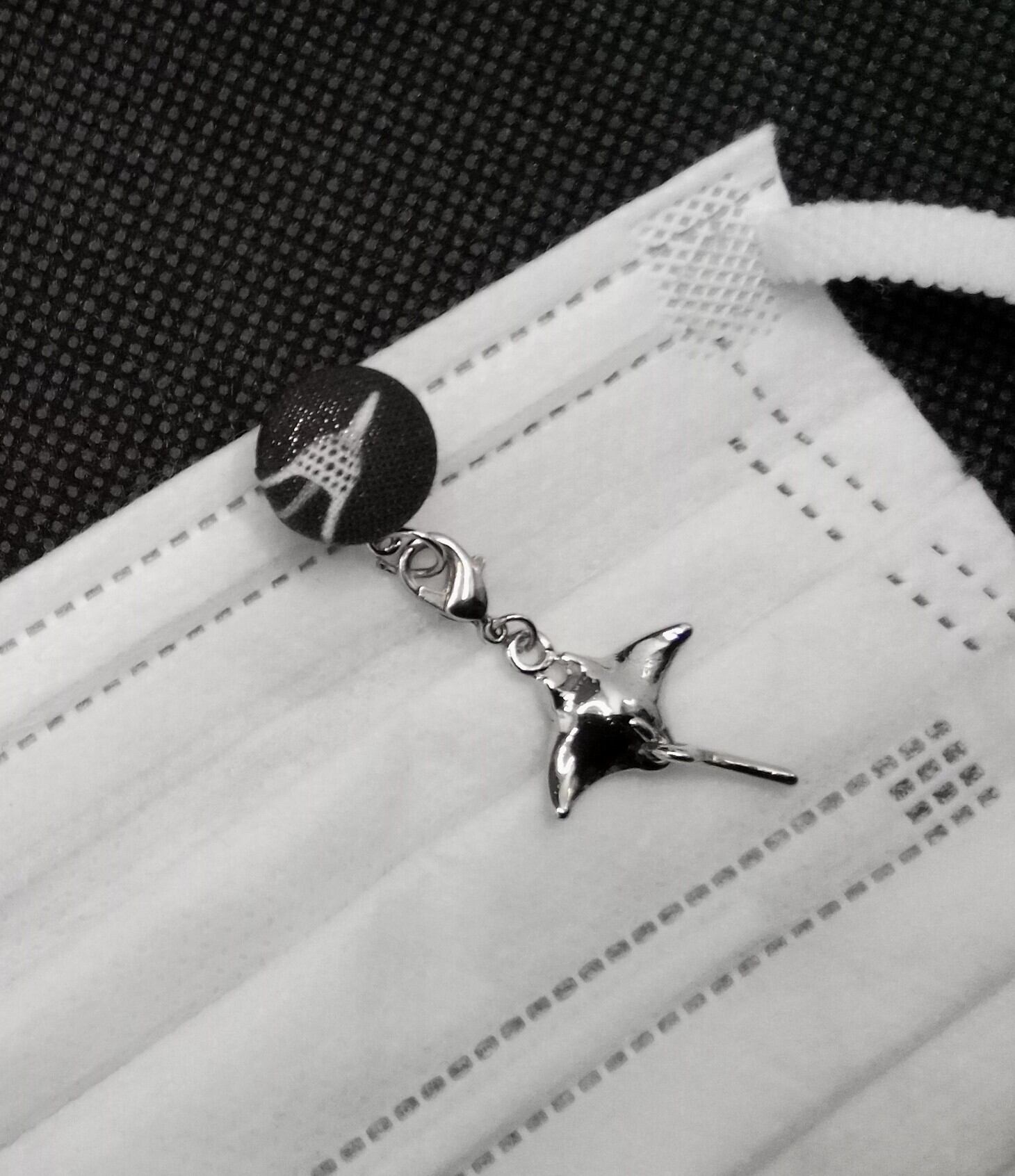 〇着せ替えくるみボタン(φ12㎜)+着せ替えのクリップ式マスク飾り・チャーム付き(銀色)のセット。