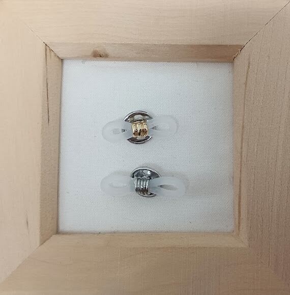 耳にかける方からシリコンゴムの輪を二つとも通して、テンプル(つる)の好きな場所でとめます。
